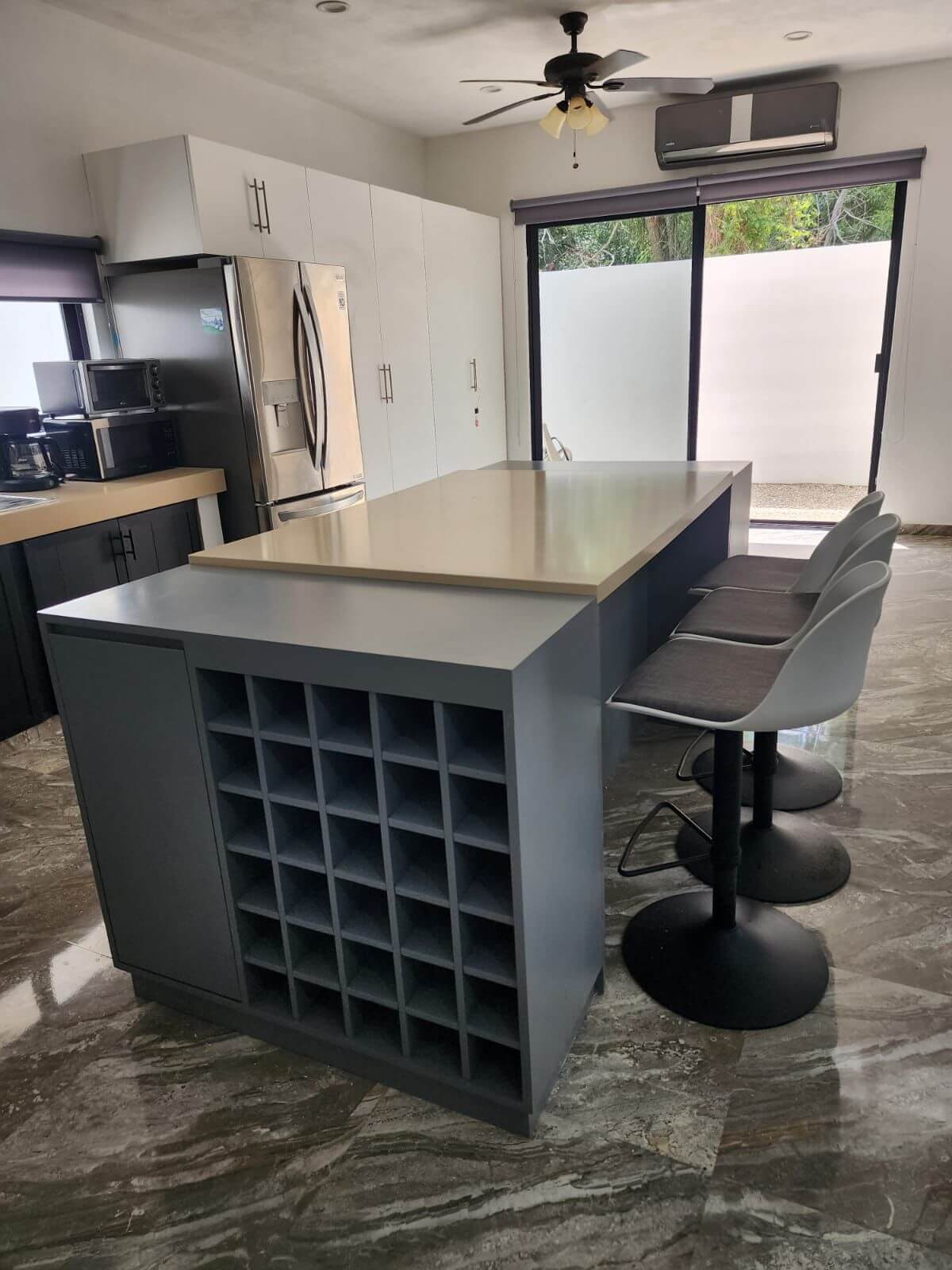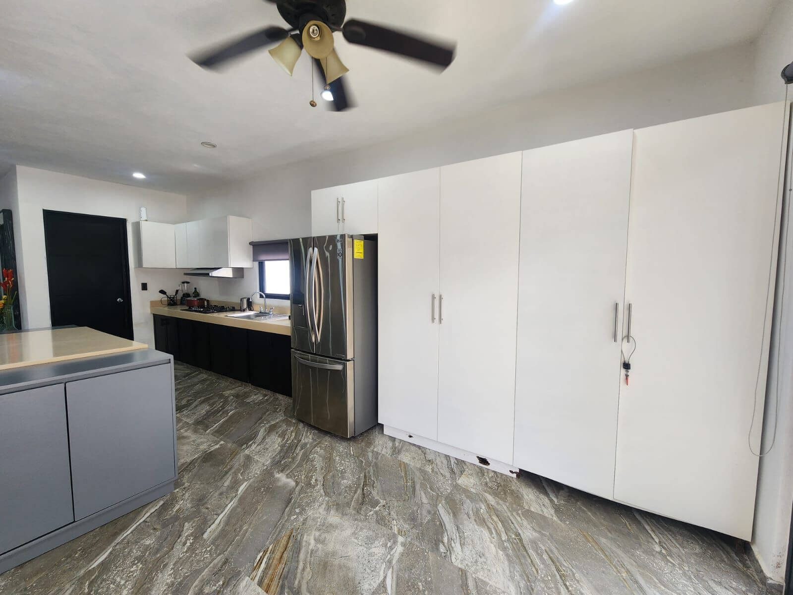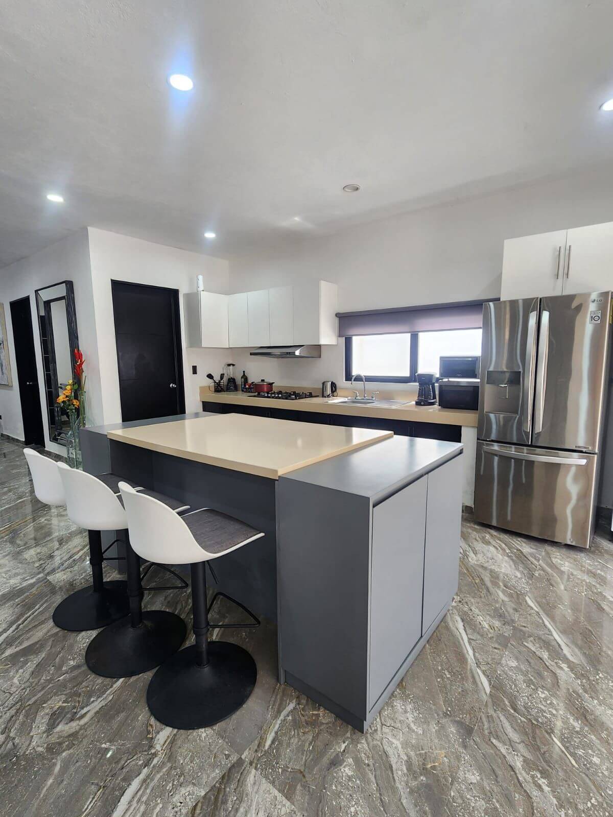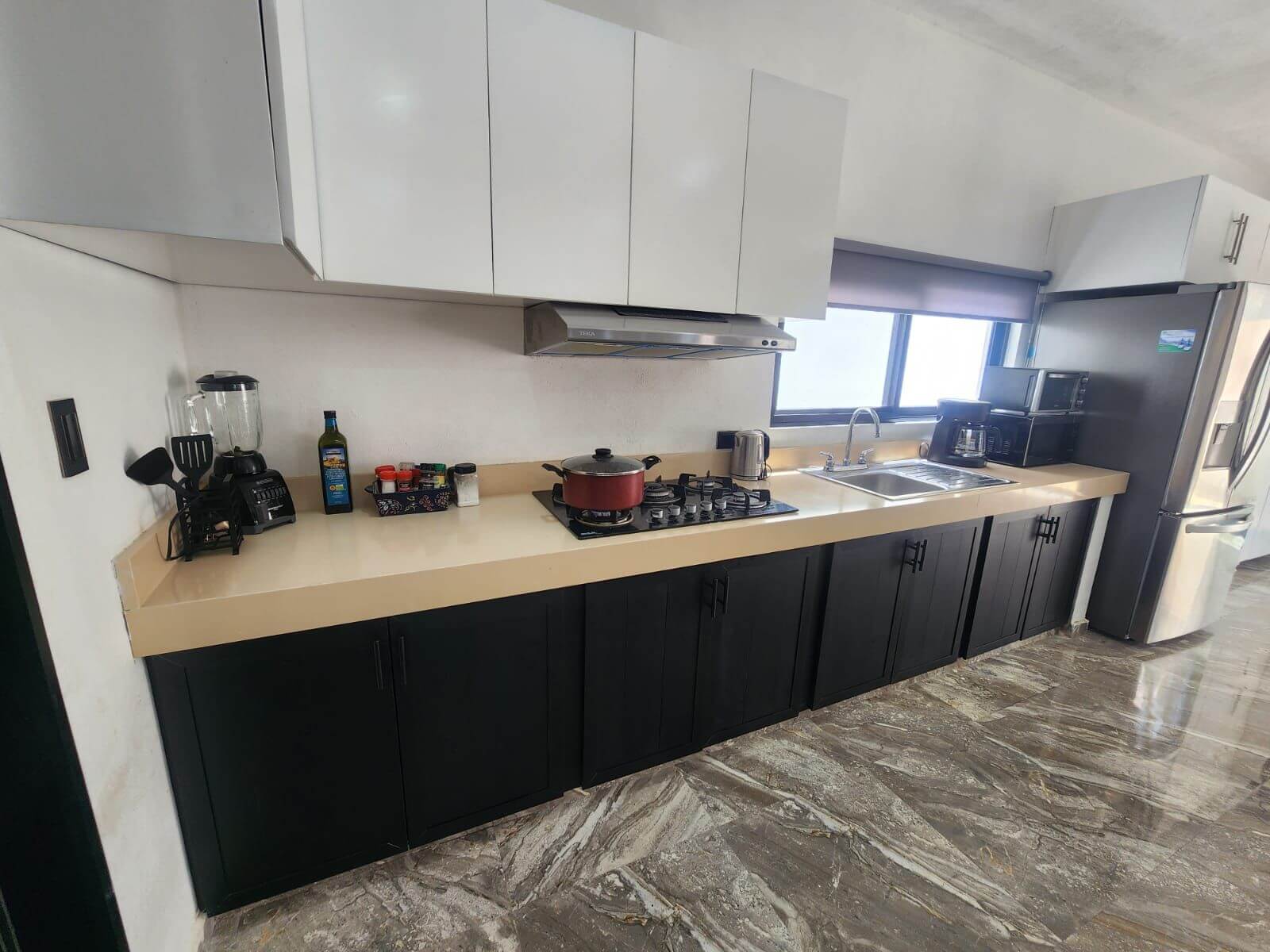 Cocina integral equipada con estufa, campana, isla/desayunador y cajones amplios.