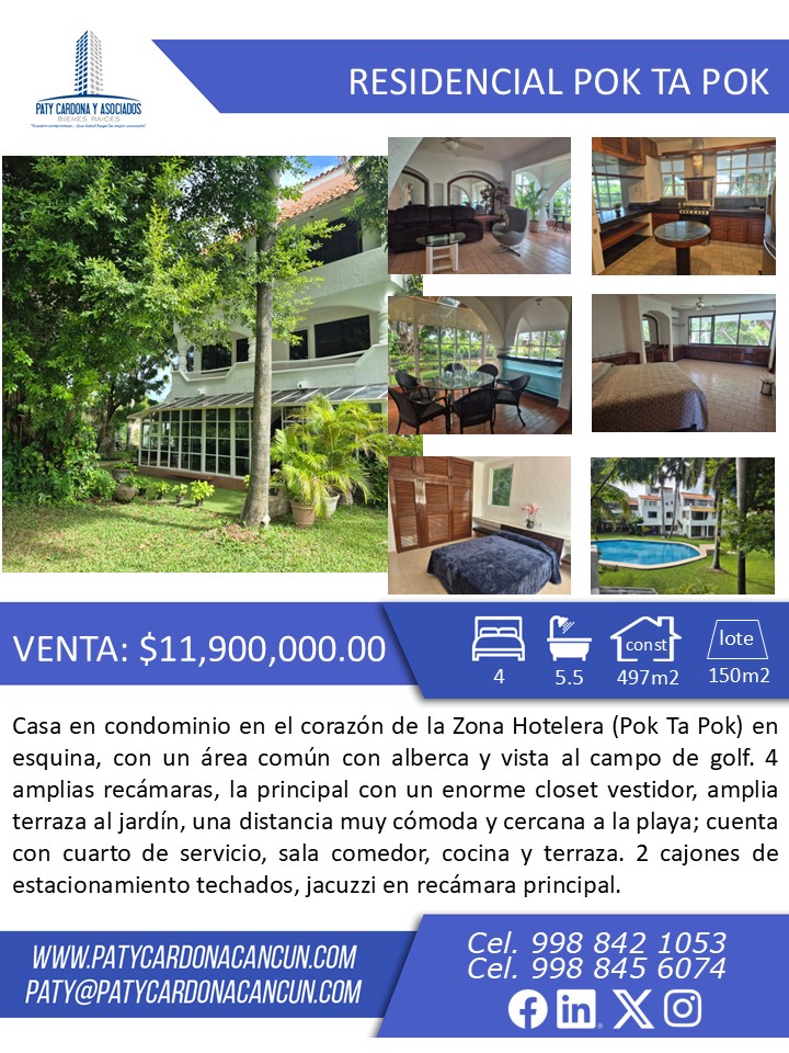 Casa en condominio en el corazón de la Zona Hotelera (Pok Ta Pok) en esquina, con un área común con alberca y vista al campo de golf. 4 amplias recámaras, la principal con un enorme closet vestidor, amplia terraza al jardín, una distancia muy cómoda y cercana a la playa; Cuenta con cuarto de servicio, sala comedor, cocina y terraza. 2 cajones de estacionamiento techados, jacuzzi en recámara principal.