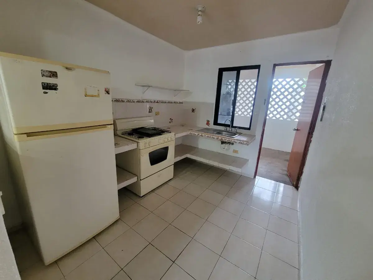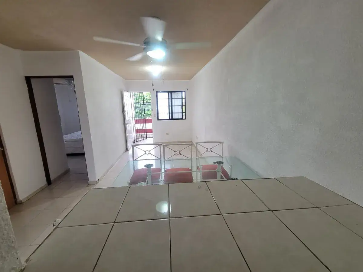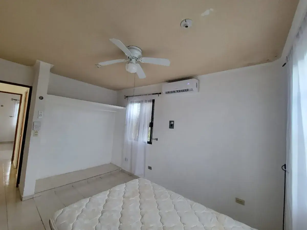 Departamento ubicado en un edificio de dos niveles, con fachada de estilo tradicional y acceso principal desde la planta baja. El entorno exterior cuenta con áreas verdes y espacio para estacionamiento, brindando comodidad y funcionalidad. El interior del departamento presenta un diseño sencillo, con pisos de cerámica y paredes en tonos claros que favorecen la iluminación natural. El área de sala-comedor es amplia y conecta directamente con la cocina, la cual está equipada con estufa, refrigerador y fregadero, además de contar con ventilación natural gracias a una ventana y acceso a un área exterior. La recámara principal dispone de cama, ventilador de techo y aire acondicionado, ofreciendo un ambiente adecuado para el descanso. Las ventanas cuentan con cortinas y protecciones, aportando privacidad y seguridad. Este departamento es una opción práctica para quienes buscan un espacio funcional en un entorno residencial.