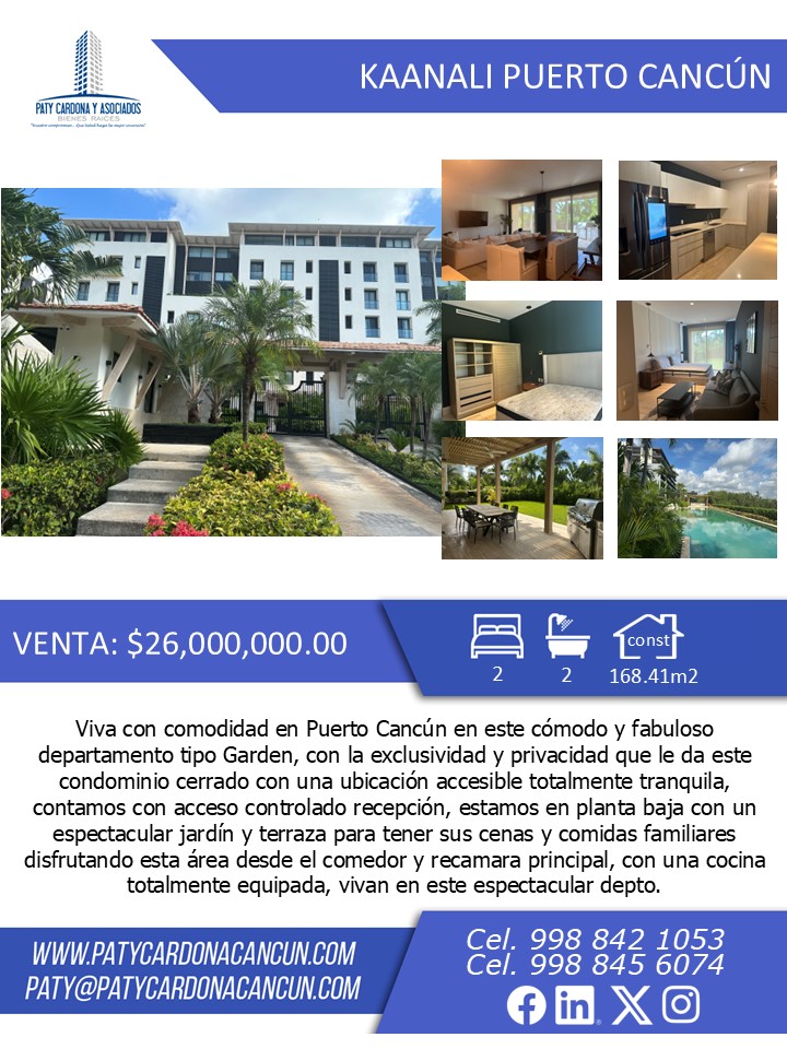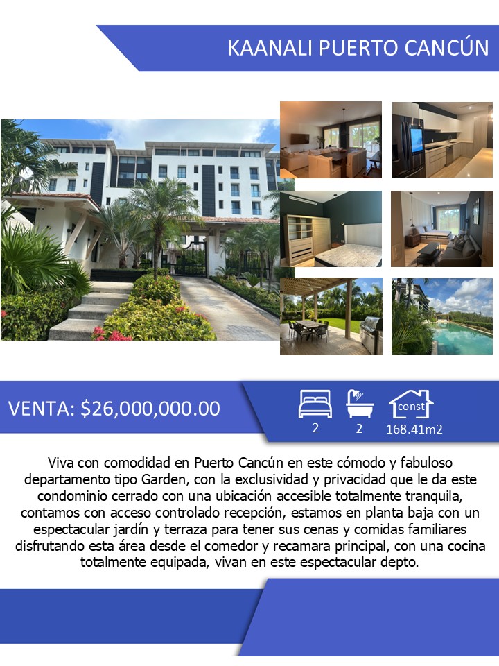 Viva con comodidad en Puerto Cancun en este cómodo y fabuloso departamento tipo Garden, con la exclusividad y privacidad que le da este condominio cerrado con una ubicación accesible totalmente tranquila, contamos con acceso controlado recepción, estamos en planta baja con un espectacular jardín y terraza para tener sus cenas y comidas familiares disfrutando esta área desde el comedor y recamara principal, con una cocina totalmente equipada, vivan en este espectacular departamento.