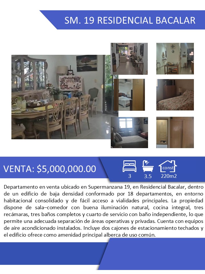 Departamento en venta ubicado en Supermanzana 19, en Residencial Bacalar, dentro de un edificio de baja densidad conformado por 18 departamentos, en entorno habitacional consolidado y de fácil acceso a vialidades principales.