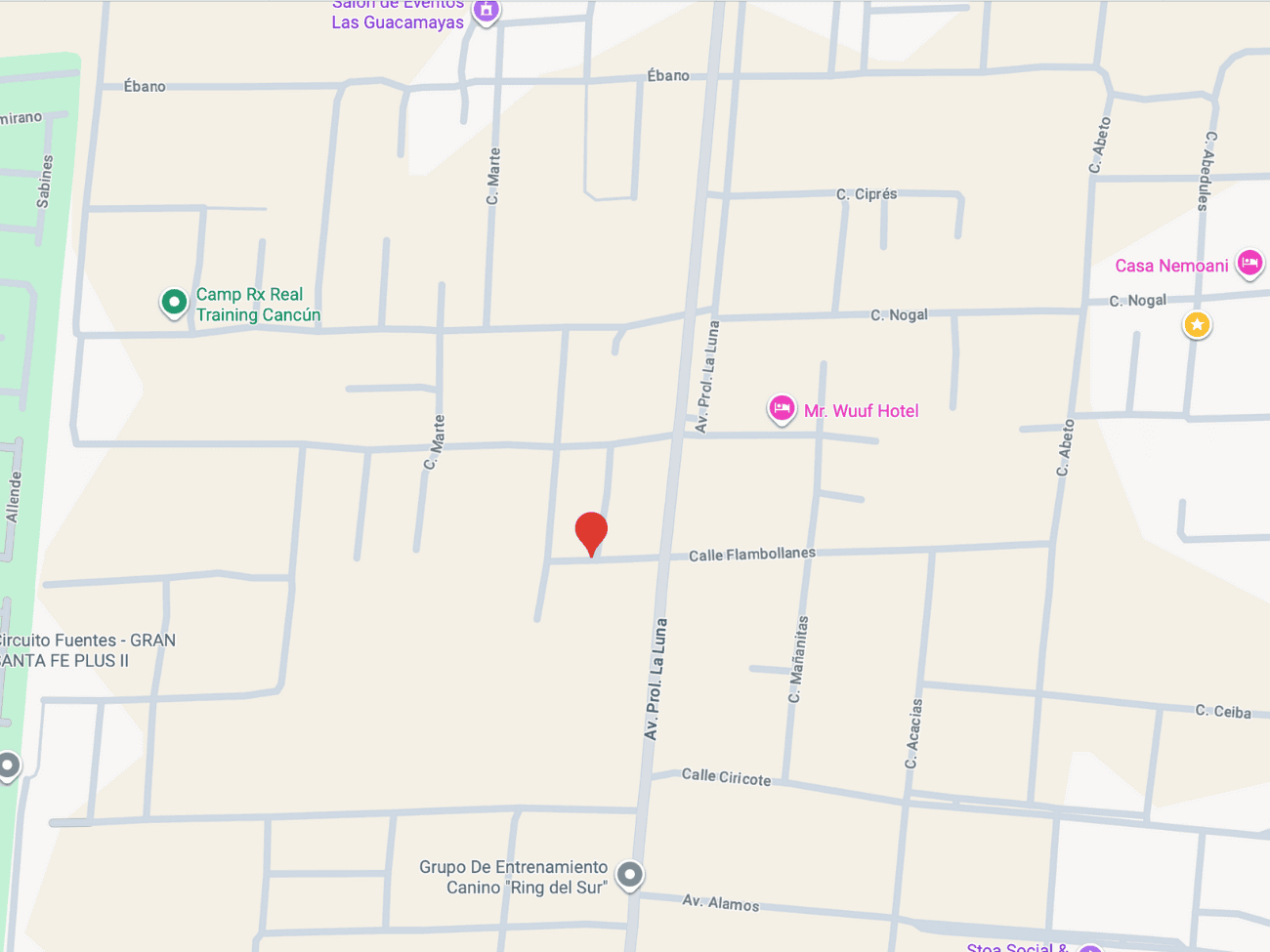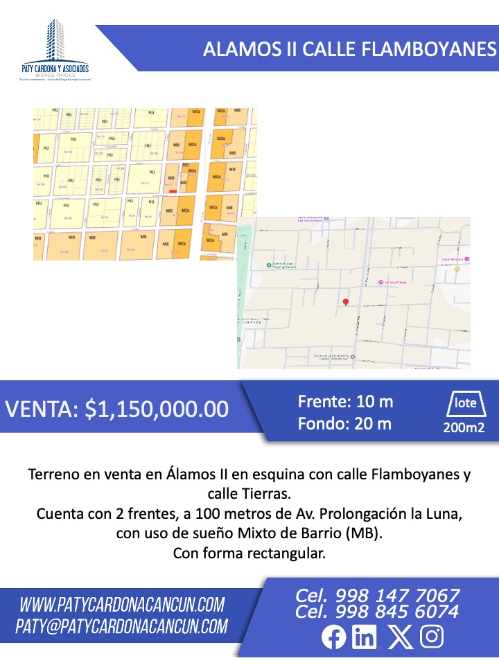 Terreno en venta en Álamos II en esquina con calle Flamboyanes y calle Tierras. Cuenta con 2 frentes, a 100 metros de Av. Prolongación la Luna, con uso de sueño Mixto de Barrio (MB). Con forma rectangular.