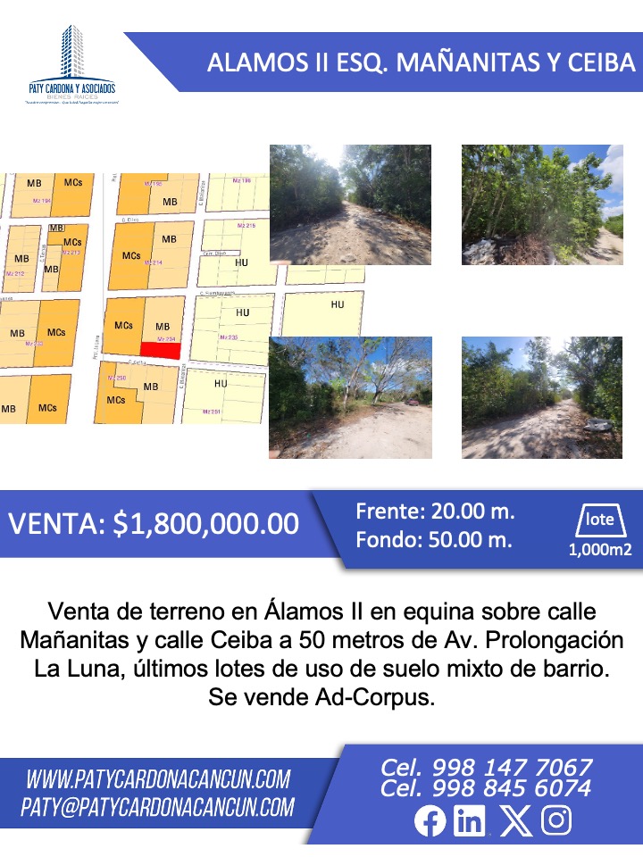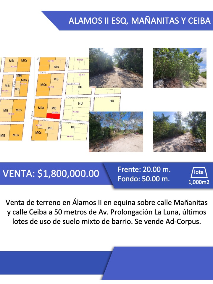 Venta de terreno en Álamos II en equina sobre calle Mañanitas y calle Ceiba a 50 metros de Av. Prolongación La Luna, últimos lotes de uso de suelo mixto de barrio.