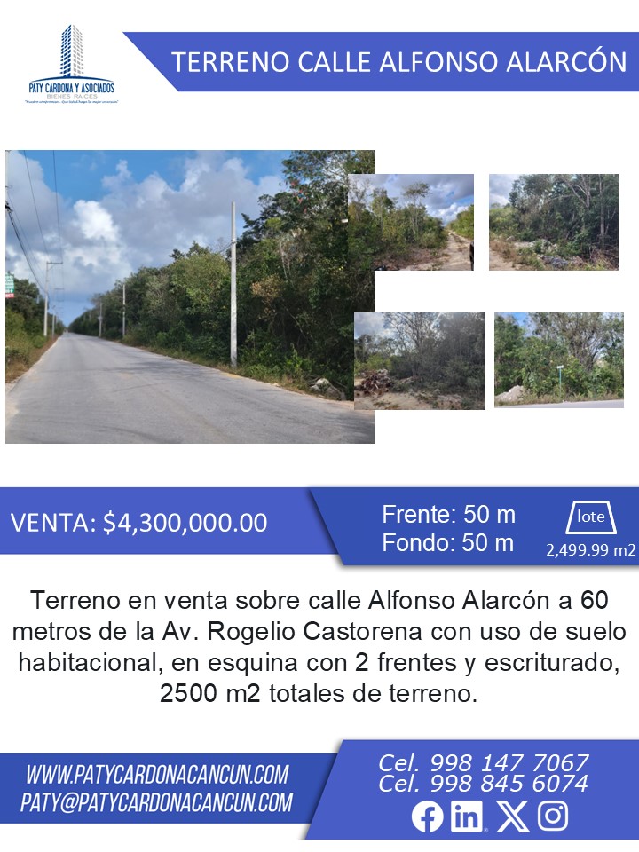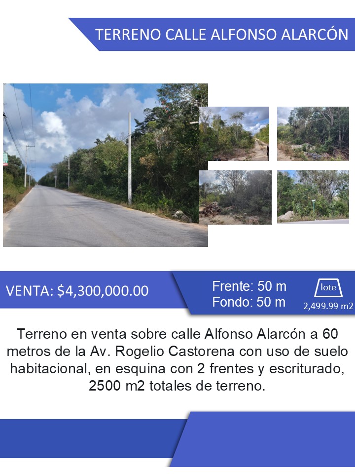 Terreno en venta sobre calle Alfonso Alarcón a 60 metros de la Av. Rogelio Castorena con uso de suelo habitacional, en esquina con 2 frentes y escriturado, 2500 m2 totales de terreno.