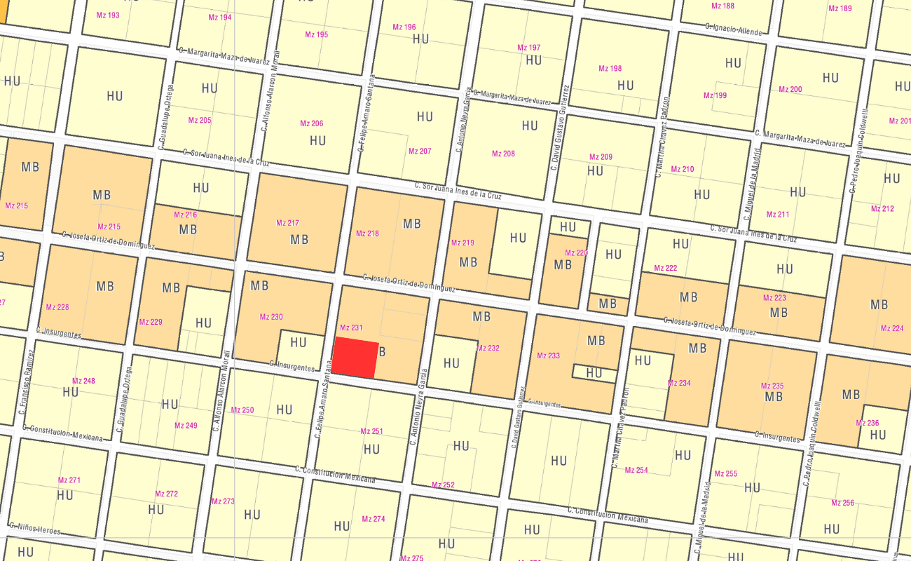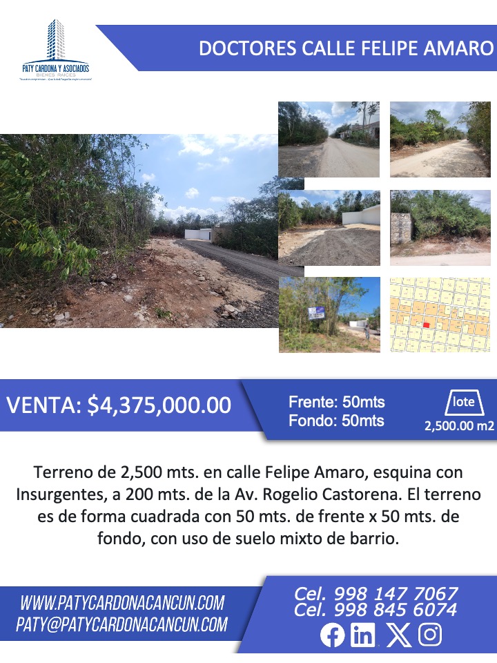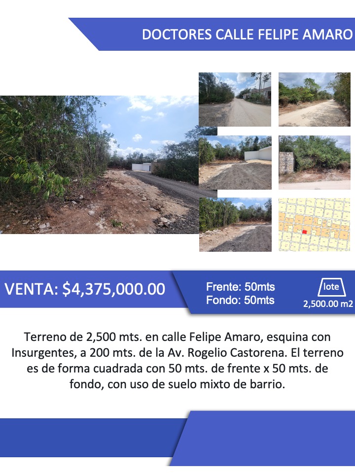 Terreno de 2,500 mts. en calle Felipe Amaro, esquina con Insurgentes, a 200 mts. de la Av. Rogelio Castorena. El terreno es de forma cuadrada con 50 mts. de frente x 50 mts. de fondo, con uso de suelo mixto de barrio.